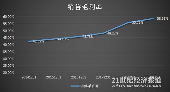 尽管销量在今年同比出现了下降,但涪陵榨菜2019年的销售毛利率却依然维持增长态势,由2018年的55.76%上升至2019年的58.61%。这也使得涪陵榨菜在销量减少的情况下,营收依旧能保持增长,这情况的发生建立在10年来涪陵榨菜持续提价的销售策略上。