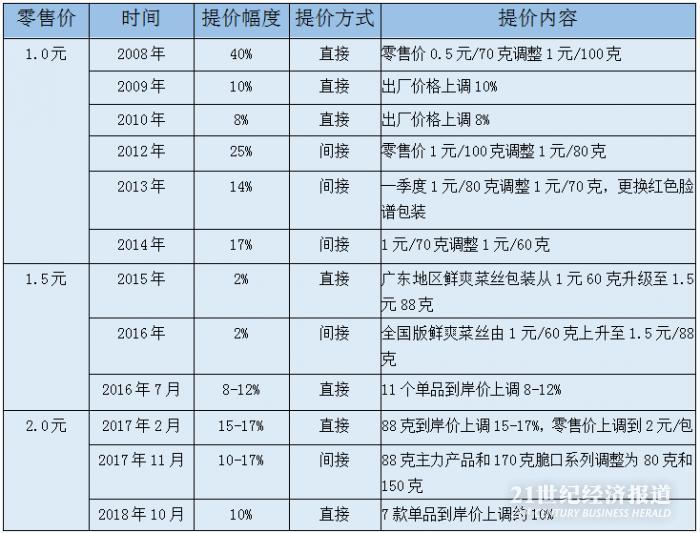 据不完全统计,在2008年至2018年期间,因为天然灾害、原材料价格浮动以及公司战略发展需要,涪陵榨菜共计提价12次,价格由0.5元涨至2元,涨幅达到400%。市场上甚至拿涪陵榨菜的涨幅与贵州茅台的涨幅相比,结果茅台不敌榨菜。连年涨价也使得了毛利率不断攀升。