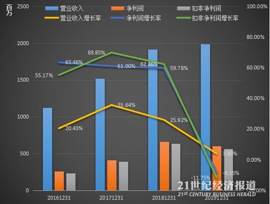 涪陵榨菜2019年年度财报数据显示,2019年度实现营业收入19.9亿元,同比增长3.93%;归母净利润6.05亿元,同比下降8.55%;扣非净利润5.63亿元,同比下降11.75%。自2015年以来首次出现负增长的情况。
