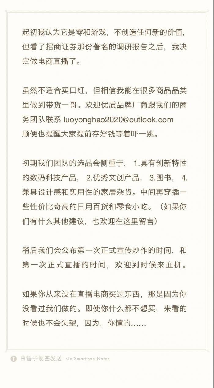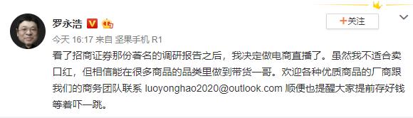 3月19日,罗永浩通过实名认证微博表示,看了招商证券那份调研报告之后,决定做电商直播了。