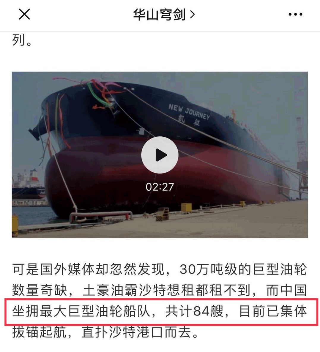 昨夜今晨,伴随国际油价的暴跌,一篇自媒体文章“中国84艘巨轮直扑海湾”刷屏。