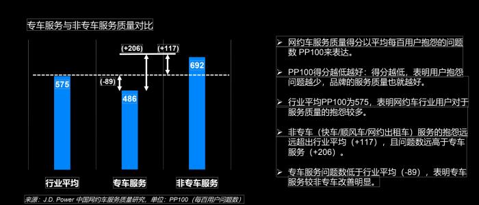 “中国移动出行市场规模快速增长,移动出行用户将近5亿人,汽车出行市场容量达到3800亿元。”J.D. Power中国区汽车数字化产品体验总监裴林告诉21世纪经济报道记者,“根据调查,网约车服务质量整体行业PP100偏高,专车表现优于非专车(快车/顺风车/网约出租车)。”