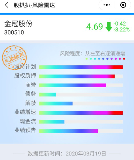 其实对于投资者来讲,我们也可以用专业的风险排除工具股扒扒小程序来看一下它的风险。比如输入300510,就可以看到金冠股份相关信息。