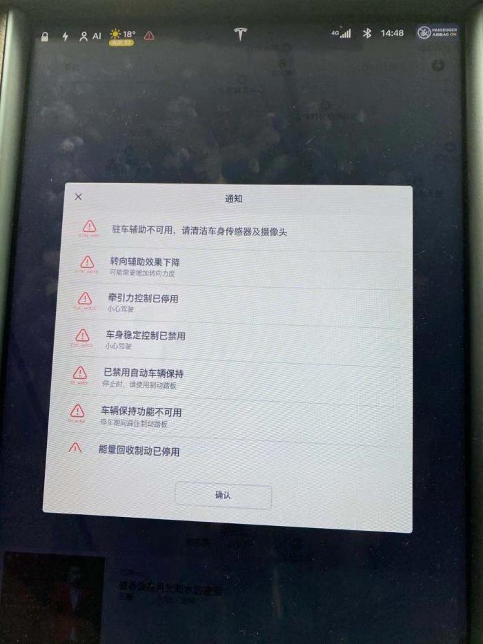 2月19日,卢先生在行驶途中突然发现,车辆中控屏幕上弹出几条故障提示,很多自动辅助驾驶功能显示“不可用”或“禁用”,能量回收制动功能也显示停用。