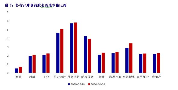 如图7所示,年初至今外资持股仍主要集中于消费的态势延续,但呈现较大幅度净流出可选消费、能源、电信服务行业的趋势,而医疗保健行业获外资逆势增持。3月以来,全球新冠肺炎疫情持续发酵,影响市场情绪和风险偏好回落,各行业外资持股比例均呈现不同程度的下行,其中受国际油价下行影响,能源行业外资减持幅度居前,其次为金融和日常消费行业。截止3月19日,本周工业、房地产、消费行业外资持股比例减少幅度较大。