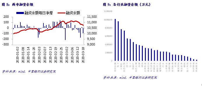 两融余额仍维持高位。如图8所示,截至3月18日,沪深两融余额为10,904亿元,较前一日减少82.58亿元。其中融资余额10,745.83亿元,较前一日减少91.44亿元,融券余额158.17亿元,较前一日增加8.86亿元,两融余额维持在高位。如图9所示,两市融资余额主要集中于非银金融、电子、计算机、医药生物。