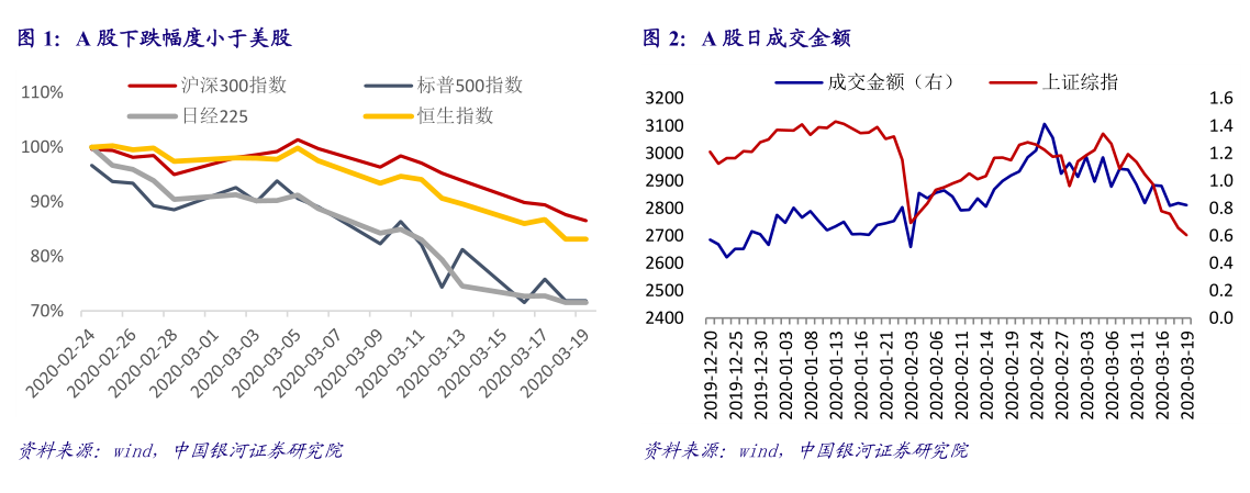 全球股市下跌调整,A股近期走势强于美股。近期海外股市接连暴跌,而A股下跌调整幅度相对可控,A股走势相对强势。如图1所示,以2月21日美股下跌调整为基准,截至3月19日收盘,A股下跌幅度为12.27%,同期,标普500指数、东经225指数和香港恒生指数下跌幅度分别为28.15%、28.48%和18.37%。近期A股走势明显强于美股,我们认为主要是受疫情影响所致,中国疫情有效控制有序复工,而海外疫情不容乐观,正处于爆发期,未来不确定性强,预计A股相对美股的强势行情仍将延续。