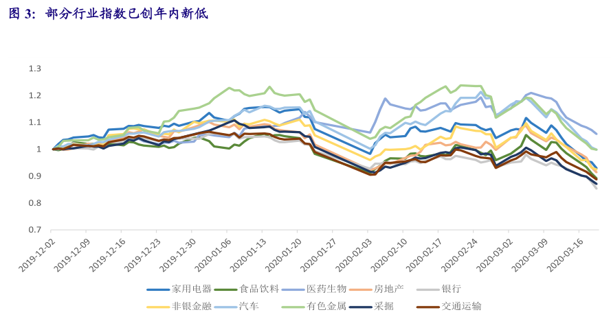 金融、房地产、医药、食品饮料行业,市场悲观情绪释放较为充分,安全边际逐渐提高。多数行业指数已触及春节后的市场底部,金融、地产、大消费板块随着外资加速流出调整幅度较大,虽然不排除基本面预期受全球疫情影响继续下修的可能,但是在恐慌情绪是目前主导全球资产下挫的主要原因的环境下,悲观情绪的释放一定程度上有利于板块率先企稳,此外金融、消费等核心资产中长期基本面稳健的趋势不受疫情的短期扰动,同时核心资产配置价值突显有望吸引保险、银行理财等长线资金增加配置,推荐重点关注金融、房地产、医药、食品饮料。