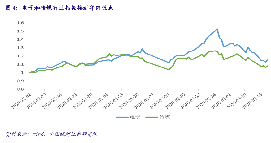 多数行业指数已接近或突破春节后的市场底部,短期风险释放已较为充分。如图3所示,随着全球新冠肺炎疫情持续发酵、外围市场波动性加强、经济基本面受冲击较大、外资持续净流出等多重因素共振,家电、食品饮料、医药生物、房地产、银行、非银金融、汽车、有色金属、采掘、交通运输行业指数已创年内新低,较高点回落幅度中位数约15%,短期风险释放已较为充分。我们认为,现在应该开始重点关注短期风险释放较为充分的板块中,基本面稳健、确定性较强、受外贸影响相对较小的行业,例如金融、房地产、食品饮料、医药生物。此外如图4所示,科技板块中电子、传媒行业指数也已接近春节后的市场底部,分别较2月25日高点回落24.46%、13.69%,估值的安全边际增厚。