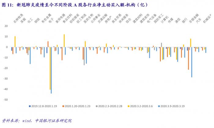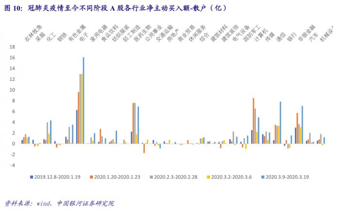 散户资金投资热度较高,机构资金较为谨慎。如图10所示,新冠肺炎疫情发酵至今,散户资金投资热度持续较高,电子、计算机、医药生物、通信等热门板块持续获散户资金净流入。然而如图11所示,机构资金相对谨慎,阶段性呈现净流入电子、计算机、食品饮料等热门板块的态势,但持续性较弱,机构资金量的波动性较散户资金相比较强。整体来看,虽然机构资金与散户资金在行业选择上持续呈现相反偏好,但却在电子、计算机等科技板块阶段性达成共识,显示市场对科技板块的景气趋势有较强的一致预期。