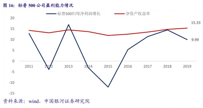 最后,从美股公司盈利方面看,美股公司盈利能力有减弱迹象。当前基于已披露的2019年年数据分析,如图16所示,美股公司净资产收益率为15.33%维持在较高水平,然而归母净利润同比增长率方面出现下滑迹象,净利润增速不及前两年,美股公司盈利的成长性有所减弱,难以支撑当前较高的市盈率水平。
