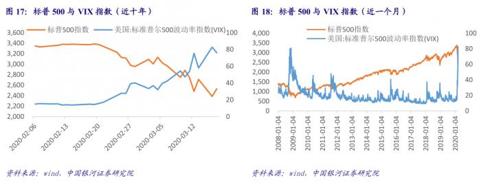标普VIX指数超过次贷危机时高点。如图17所示,全球疫情蔓延美股快速暴跌,标普VIX指数走高,3月12日美股熔断,标普VIX指数攀升至75.47,16日VIX恐慌指数上升至82.69,如图18所示,超过次贷危机时高点,市场避险情绪进一步提升。回顾次贷危机时期标普VIX走势,如图19所示,08年10月美股快速下跌,于10月27日VIX攀升至80.06,短暂企稳后美股继续走低,于11月20日VIX再创新高至80.86,随后美股持续走弱于09年3月见底,VIX指数阶段性高点并非次贷危机时股市底部,随后标普500指数继续下跌19.6%,标普VIX指数阶段性高点,并不一定是股市底部。