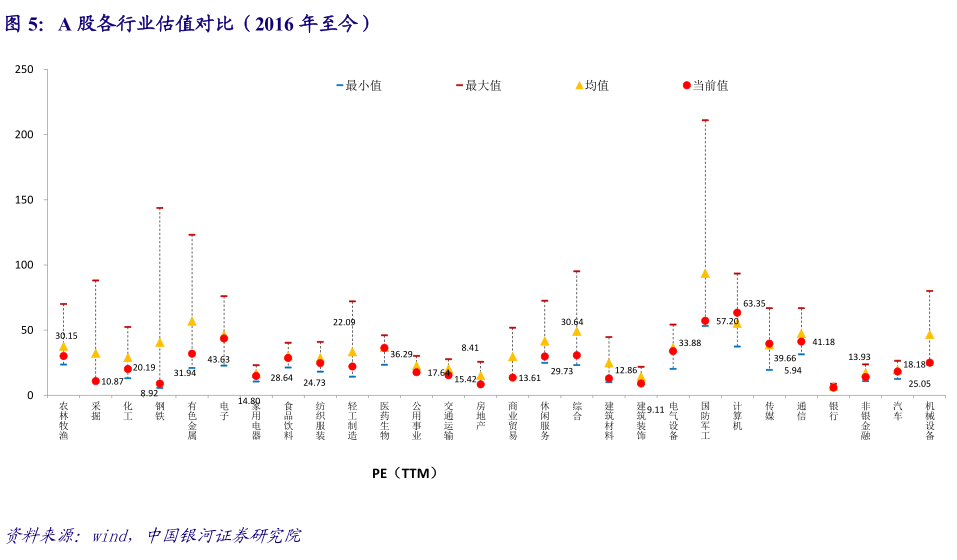 行业估值方面,如图5所示,计算机行业估值略高于其自身历史中枢水平,电子、食品饮料、医药生物、传媒、通信行业的估值处于其自身历史中枢水平,无明显回调压力,银行、钢铁、房地产等行业的估值相对较低。各行业估值整体处于合理水平,较前期高点已明显回落。预计未来行业间相对估值或将维持,低估值板块有有限的估值上修空间。