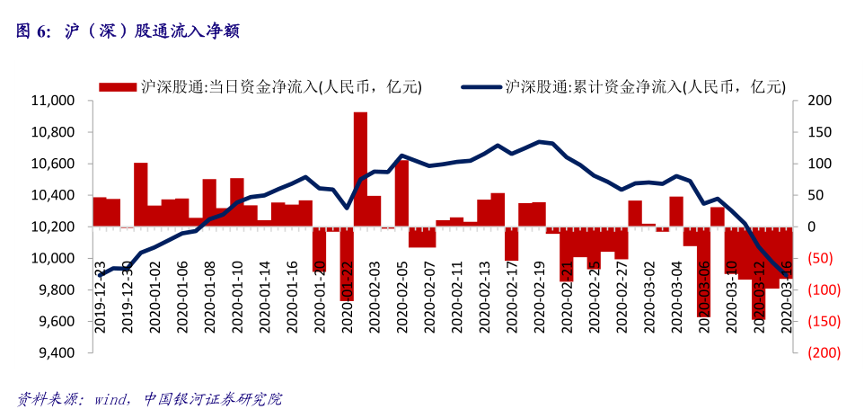 北上资金净流出金额102.21亿元。3月19日,如图6所示,当日北上资金小幅净流出102.21亿元,北上资金近七个交易日延续大幅净流出态势。今年以来,在1月份及2月初,北上资金主要呈净流入态势,其中1月份累计净流入达383.92亿元。北上资金由净流入转为净流出的拐点出现在2月21日,因美股受疫情影响出现下跌调整,北上资金由此转为净流出,随后净流出态势延续至今。