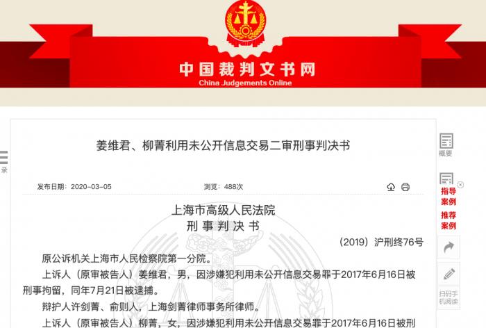 2019年6月14日,上海市中院作出一审判决,法院认为,上述情节特别严重,双方的行为均已构成利用未公开信息交易罪,且系共同犯罪,判处姜维君有期徒刑六年六个月,并处罚金4000万元;判处柳菁有期徒刑四年六个月,并处罚金620万元。