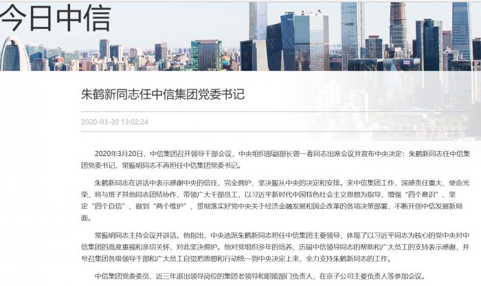 2020年3月20日,中信集团召开领导干部会议,中央组织部副部长曾一春同志出席会议并宣布中央决定:朱鹤新同志任中信集团党委书记,常振明同志不再担任中信集团党委书记。