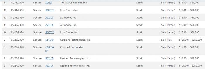 凯利·洛弗勒,她的丈夫杰弗里·斯普雷彻也是纽约证券交易所的董事长,从1月24日开始售出27只股票,价值数百万美元。那天,凯利·洛弗勒在社交媒体上说她参加了参议院关于冠状病毒的介绍会。这对夫妇出售的股票属于埃克森美孚、罗斯百货和汽车地带。