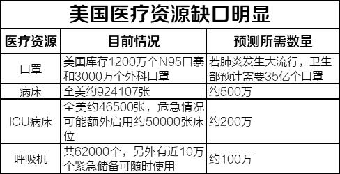 此次疫情中,医疗资源不足、医疗分配不均短板明显。根据美国医院协会及专业机构关于疫情的预测,此次防疫在医疗设备方面存在明显的缺口,若病例在短期内激增,可能出现挤兑。此外,医护人员不足在基层也尤为明显。据美联社报道, 2008以来减少了6万名医疗员工,地方医疗人力和资源不足,必须从毒品防治等其他部门借调人手,突然的疫情爆发,资源不得不重新分配,也可能危及其他病患。另外,美国各州的医疗资源分配差异较明显。例如,加州圣伯纳汀诺郡(San Bernardino County)人口超过200万,卫生局却只靠三名实习生执行防范新冠肺炎的准备工作,他们负责监控390名从受疫情影响国家返美,被要求自主隔离的旅客;相较之下,华盛顿州的金恩郡有多达2400万的“雨天基金”,在疫情爆发时,当地能买下汽车旅馆和露营车隔离病患。