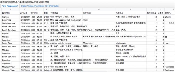 像疫情确诊数相较更多的圣特克拉拉县,21记者在一份名为《南湾超市库存共享信息》的表格上看到,上面记录了从3月15日至3月18日不同时间段县内主要超市的一些库存信息,甚至超市拥挤度、口罩率等,这是华人自发性记录前往超市购物后的感受,供其他消费者参考,还配备了一份英文翻译版。