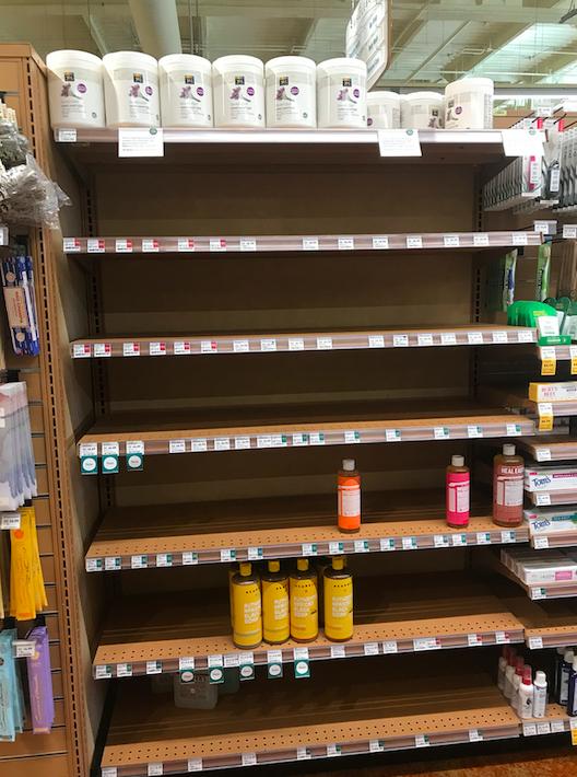 这家全食超市较空的货架包括洗手液、奶制品,还有冷冻食品柜,这些缺货的货架会被标注出每位顾客限购的数量,例如擦手纸一人限购五桶,冷冻比萨饼一人限购4盒。