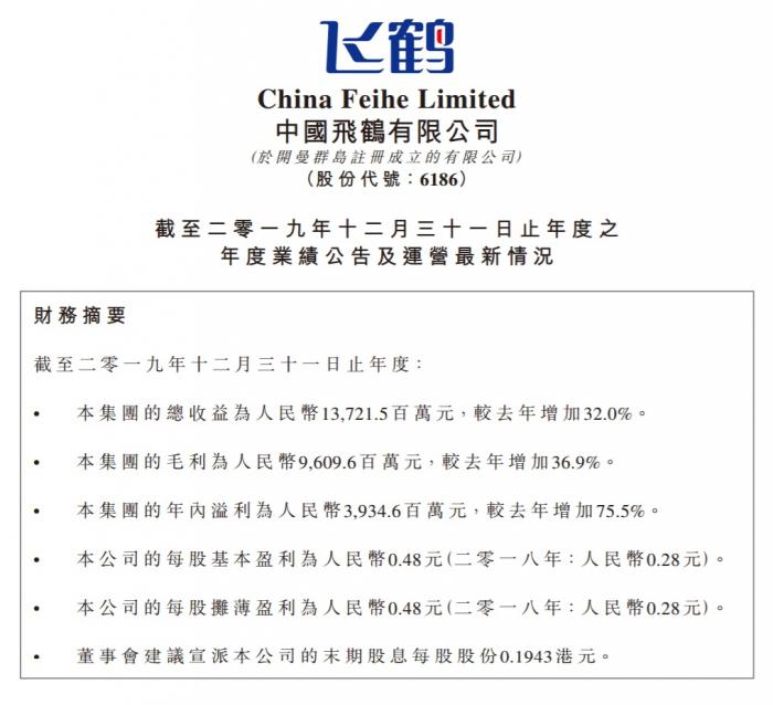 3月23日傍晚,中国飞鹤(06186.HK)披露上市后首份业绩报告。报告显示,去年飞鹤全年实现营业收入137.22亿元,较上年同比增长32%,实现净利润39.35亿元,同比增长75.5%。
