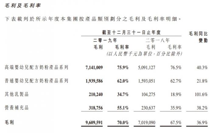 而在毛利率方面,去年飞鹤婴幼儿奶粉无论是高端还是普通都略有下降,高端奶粉毛利率75.9%,普通奶粉毛利率62%,分别比2018年微降0.6和0.7个百分点。但其他乳制品的毛利率则从18.9%提高至34.7%,营养补充剂的毛利率也从35.9%提高至55.1%,所以最终飞鹤在2019年的毛利率为70%,比2018年提升2.5个百分点。
