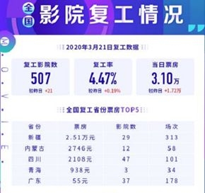 一天3万元,相比以往每个休息日动辄2亿元的票房似乎杯水车薪,但对于备受疫情冲击的影视行业而言,已经是一个不错的开始了。截至目前,全国已经有507家影院复工,主要为新疆、内蒙古、四川、青海等地的影院。