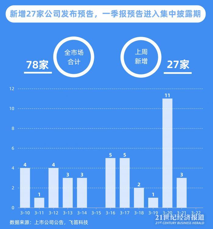 数据显示,截至3月23日,共有78家A股上市公司发布一季度业绩预告,上周(3月16日-3月22日)新增一季度业绩预告发布公司27家,前两周新增发布分别为13家和19家,一季报预告开始进入集中披露期。