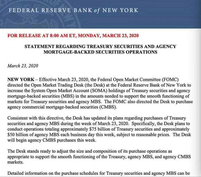 周一的声明是美联储迄今为止最激进的市场干预行动。此前,美联储曾宣布将购买价值5,000亿美元的美国国债和2,000亿美元的MBS。这一新举措代表着对量化宽松政策的无限制承诺。