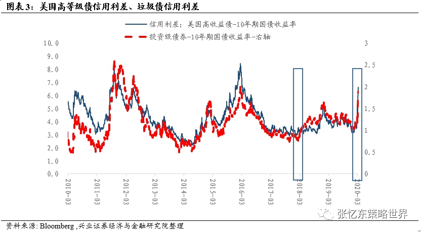 首先,传统的避险资产也同步下跌。3月9日至20日,Comex黄金下跌10.24%,甚至被认为最稳固的避风港美国国债市场也出现流动性问题,美国国债的长端市场遭遇流动性风险的冲击,投资者纷纷向更短端的2年期国债以及1年以下国库券市场避险,10年期国债收益率从3月9日的0.54%抬升到3月20日的0.84%。美国高收益债券利差本周五(3.20)突破1000bps,高达10.13%,创造了2012年以来的历史高点(高于2016年2月高点的8.39%、2011年10月欧洲危机时8.65%、互联网泡沫破灭之后的2002年最高值9.93%)。