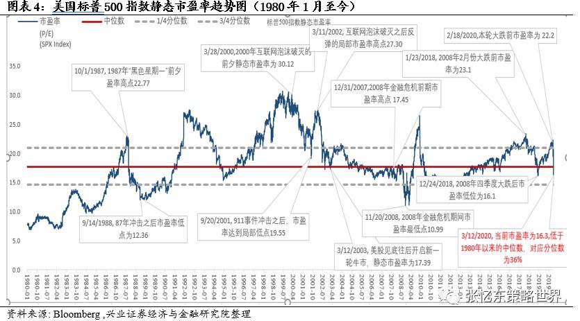 其次,在QE神话及低利率环境之下,2016年至今美国股市的整体估值在股灾之前较长时间处于历史相对高位。2020年2月18日标普500指数静态市盈率22.2倍,高于1990年以来的3/4分位数。2018年2月踩踏式大跌之前,标普静态估值为23.1倍。1987年10月黑色星期一的前夕,标普静态估值高点为22.77倍。