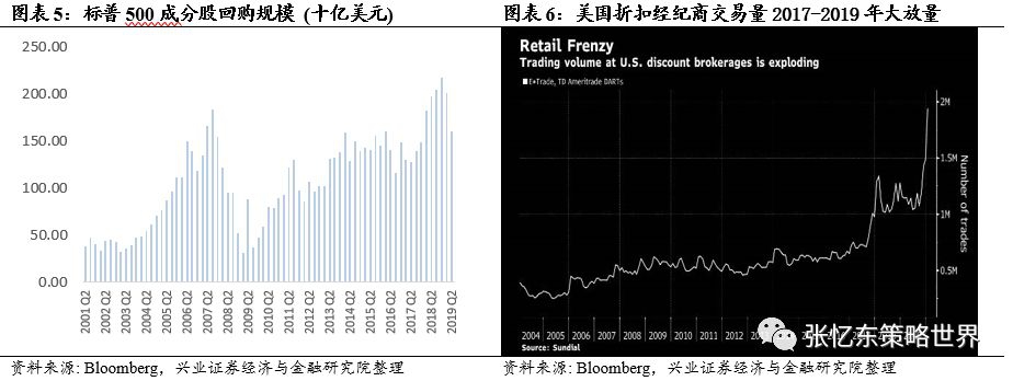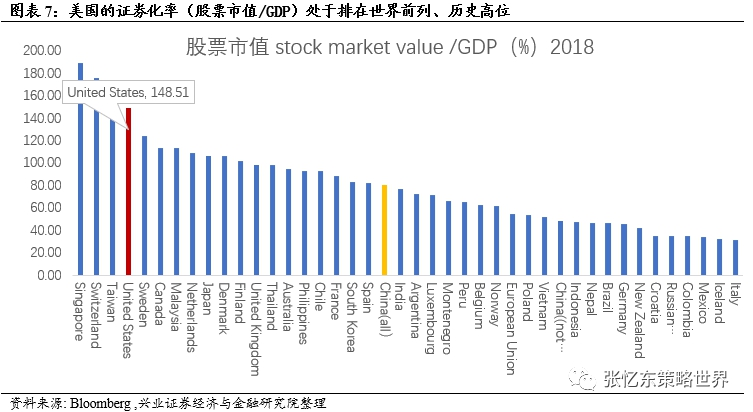 居民资产端。根据CEIC的数据,截至2019年9月最新数据,美国居民金融性资产占比为70%。根据宏观团队的测算,2008年之后居民资产负债率下降13.5%,分母端金融资产规模和金融资产价格的扩张贡献了12.7%,其中有9%受益于金融资产价格。(详参《【兴证宏观】本轮美国金融危机的起因、现状和展望》)