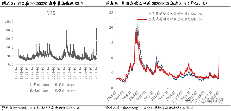 第三,金融市场恐慌程度达到历史级高度,“现金为王”成为最后的信仰,美元一改前期颓势。近两周(20200309-20200320),美元指数上涨趋势明显,涨幅达到8.35%,创造了2019年6月以来的历史高位。VIX指数3月19日盘中最高值高达82.7,这一数值为除了2008年金融危机期间以外时间的最高值。