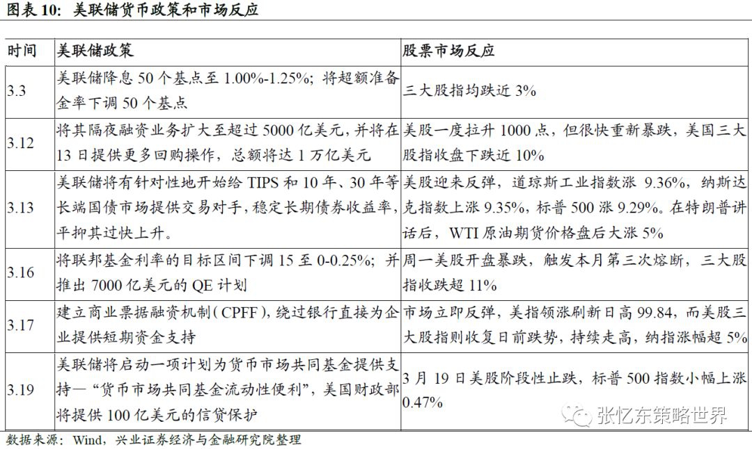 这些工具在2008年金融危机中曾饱受争议。因此,2010年《多德·弗兰克法案》对美联储创设该类紧急工具施加了更多限制,包括需事先征得财政部认可,并要求向国会提供融资对手和抵押品信息此次祭出这两项工具。美联储的QE和连续的宽松政策,并没有起到扭转乾坤的作用,3月10-20日美股三大股指接连下挫,道指跌17.3%、标普500 指数跌15.0%,纳指跌12.6%。