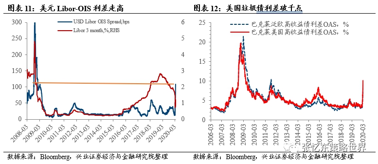 第三,美国正在加强财政政策和货币政策的协同救市。美国财政部在继续推动总规模1.3万亿美元的财政纾困方案,该方案的内容包括直接给民众发放现金支票(类似于所谓的“直升机撒钱”),向一些困难行业提供贷款支持以及税款展期。第四,美联储宣布将与加拿大央行、英国央行、日本央行、欧洲央行和瑞士央行协同行动,提高货币互换额度,进一步增加流动性。此举在于缓解此次美股流动性危机导致的全球“美元荒”。3月中旬至今,受避险情绪影响,美元指数突破100之后继续上涨,美元融资压力显著增加,Libor-OIS利差也上涨至08年次贷危机高峰前的高位,美元境外流动性的风险急剧增加,美股的流动性危机进一步向全球蔓延,各国股市、债市、大宗商品甚至黄金都全面遭到抛售。