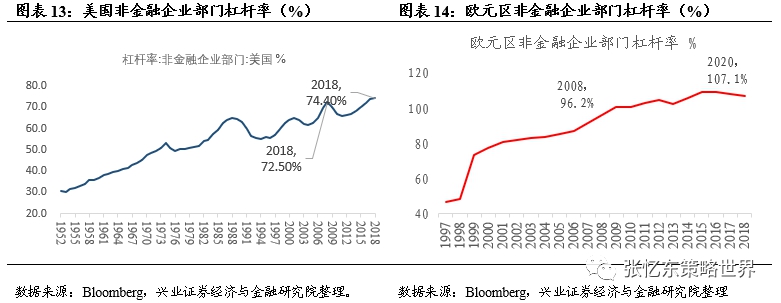 低利率环境下,企业融资成本低廉,企业债务水平越来越高。2018年美国非金融企业部门杠杆率已达到74.4%,高于2008年的水平。欧洲企业部门的债务不断抬升,2018年欧元区非金融企业部门杠杆率达到107.1%,而2008年是96.2%。