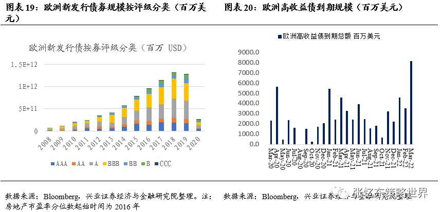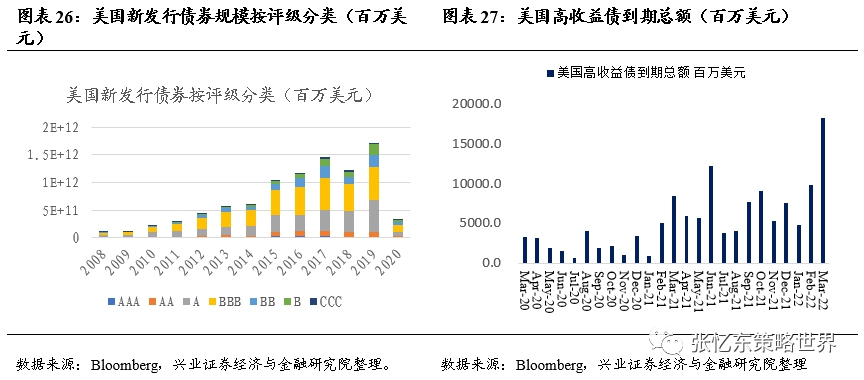 第三、美国从债务结构来看,低评级的债务规模占比大。美国投资级债券指数中接近一半为BBB级。未来两年,美国将有大量高收益债到期,其中2020年接下来的时间高收益债到期规模为228.5亿美元,2021年规模为756亿美元。