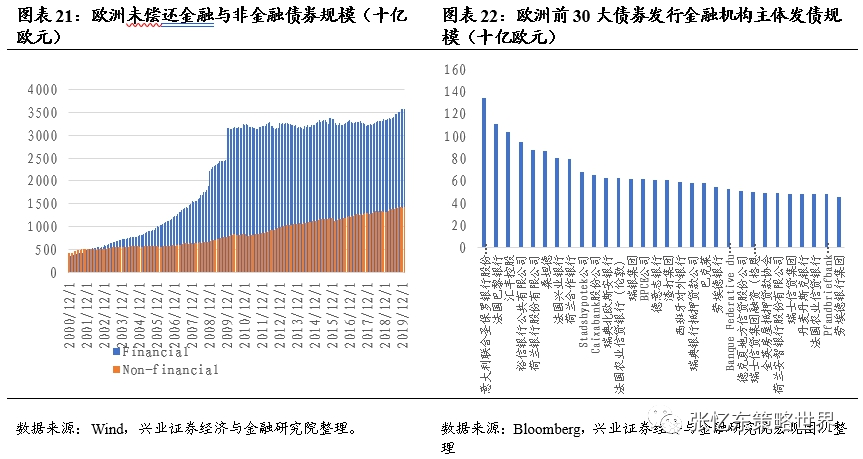 第三,欧洲金融债规模庞大,或成危机导火索。从债务结构来看,欧洲各国低评级的债务规模占比大,欧元区投资级债券指数中接近一半为BBB级。在巨量未偿还的欧洲债券中,金融债规模占比极大。截至2020年1月份,欧洲金融债未偿还规模达35771亿欧元,是非金融债券未偿还额的2.5倍。