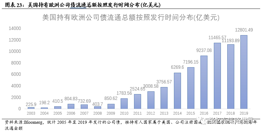 首先,美国金融机构持有大量的欧洲债务,警惕违约风险。据不完全统计(来源彭博),当前发行时间为2005-2019年的欧洲债务中,约8.8万亿美元未偿还企业债由美国机构持有。若疫情冲击使得欧洲企业收入、现金流承压,将会波及美国金融机构。