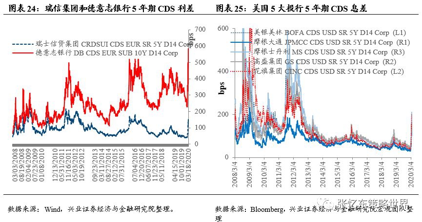 其次,近期发达市场尤其是是欧洲银行违约债务违约概率大幅提升。截至3月18日,欧洲金融巨头德意志银行5年期CDS利差大幅攀升,高于美国主要投行。瑞信、德意志银行CDS利差: 3月20日,瑞信CDS利差为至122.2bps,仍处于2017年以来的相对高位;德意志银行CDS利差达532.4bps,在本周三(0318)达到2008年以来的历史最高值后。