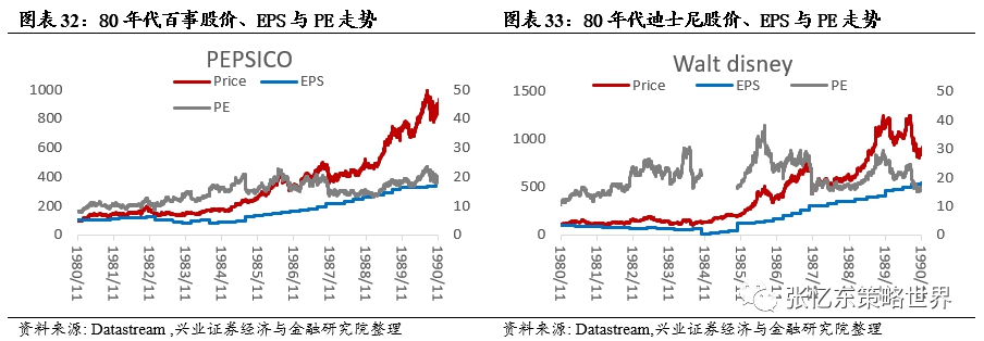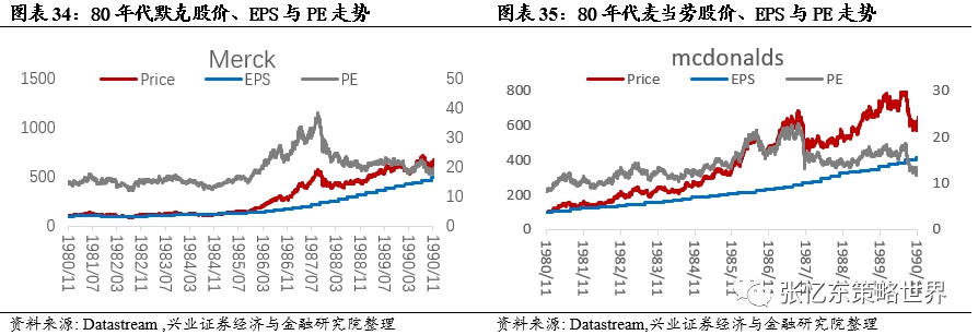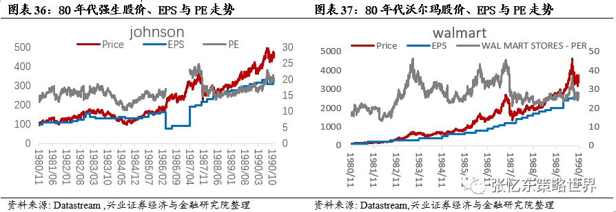 80年代,美国微观活跃,核心资产驱动美股走长牛。里根新政市场化改革、全球化竞争,加速美国经济结构调整、产业升级,导致各行业的龙头崛起、强者更强,走向全球化竞争的赢家。即使遭遇1987年股灾,标普指数在两年后才回到股灾前的高位,但是,股灾对核心资产股价的影响,最终只是快速成长途中的一个小波折。比如百事、迪士尼、默克、麦当劳、强生、沃尔玛等等代表性企业,PE都没有回到87年股灾高点,但是在EPS驱动下,1989年的股价远远超过87年的顶点。