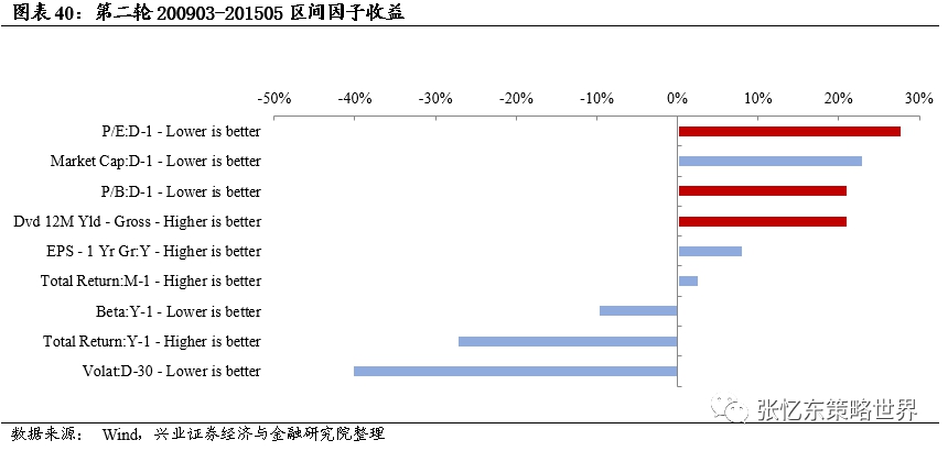 2008年金融危机之后,估值因子大幅走强,即价值股走牛。从200903-201505区间因子收益来看,本轮牛市的股价推动源于估值修复,PE和PB因子表现抢眼。此外,股息率因子表现同样抢眼。
