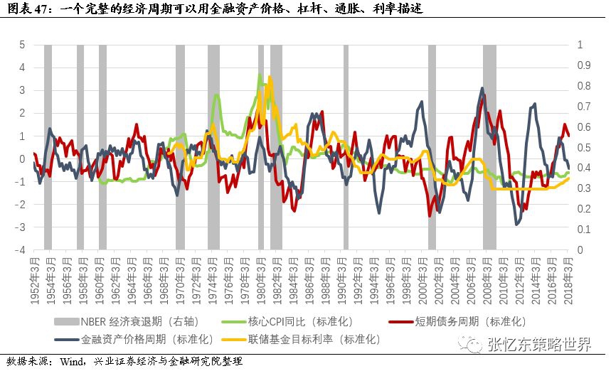 图中画圈的部分存在背离,债务处在下行周期而资产价格高歌猛进,这就是著名的2000年互联网泡沫,当泡沫破灭经济确认衰退也顺理成章。