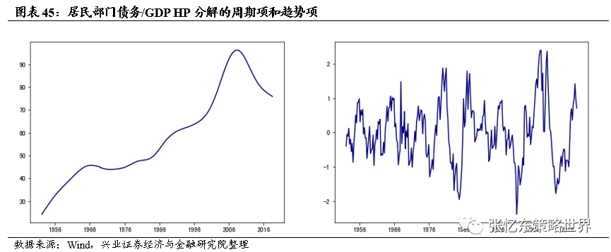 2007年美国达到长期债务周期的顶部——居民杠杆率(债务/gdp)接近100%,从2008年到现在,美国经历了一个长期的去杠杆周期。我们对美国金融资产价值占GDP比重进行HP滤波分解,并对短期债务周期和分解后的金融资产价格周期进行傅里叶变换进一步剔除噪音,保留周期部分。