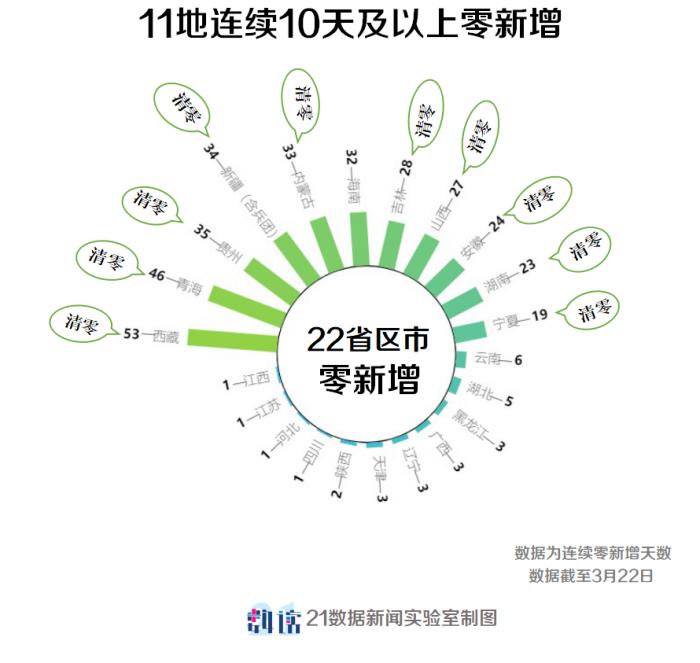 据21数据新闻实验室统计,截至3月22日24时,全国(不含港澳台,下同)新增确诊病例39例,其中湖北新增确诊病例0例(武汉0例),湖北连续5天0新增。