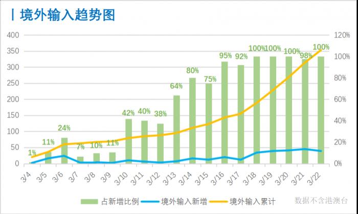 截至3月22日24时,累计报告境外输入确诊病例353例,涉及20个省市。境外输入病例连续7天占新增病例的90%以上;近7天,全国累计新增确诊病例233例,其中230例为境外输入。