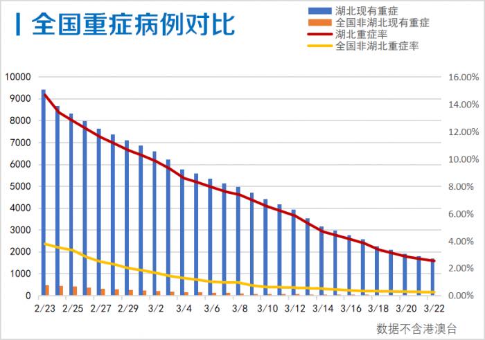 重症病例持续减少,截至3月22日24时,全国重症病例减少96例,现有重症病例降至1749例,重症率降至2.16%;湖北现有重症降至1714例(武汉1699例),重症率降至2.53%;全国除湖北重症病例降至35例,持续下降。