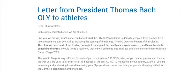 在新冠疫情“全球大流行”的阴影笼罩之下,2020年东京奥运会能否如期举行疑云重重。国际奥委会(IOC)方面传来了新消息,当地时间3月22日,(IOC)执委会于当地时间3月22日再次召开会议,随后IOC主席巴赫发表了“致运动员的信”,他表示,“取消奥运会不会解决任何问题,也不会帮助任何人,因此,这不在我们的议程上。”