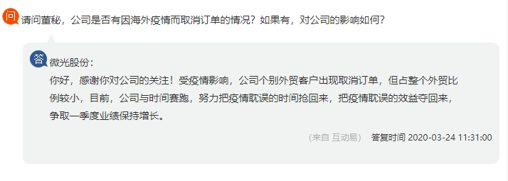 有投资者向冷链配件供应商微光股份(002801.SZ)提问,“公司是否有因海外疫情而取消订单的情况?如果有,对公司的影响如何?”