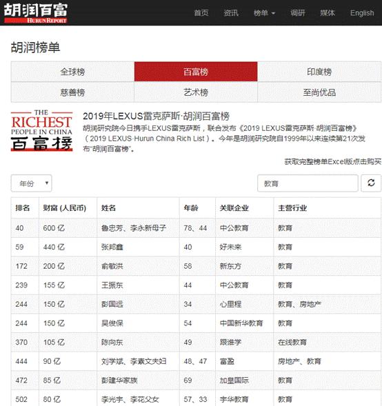 教育行业此前早已有诸多企业进军资本市场,如在美上市的新东方名声在外,新东方创始人俞敏洪也因为较高的曝光度被大家熟知。不过在胡润富豪榜上,俞敏洪还只能排在第三名,第一名的是中公教育的鲁忠芳、李永新母子。